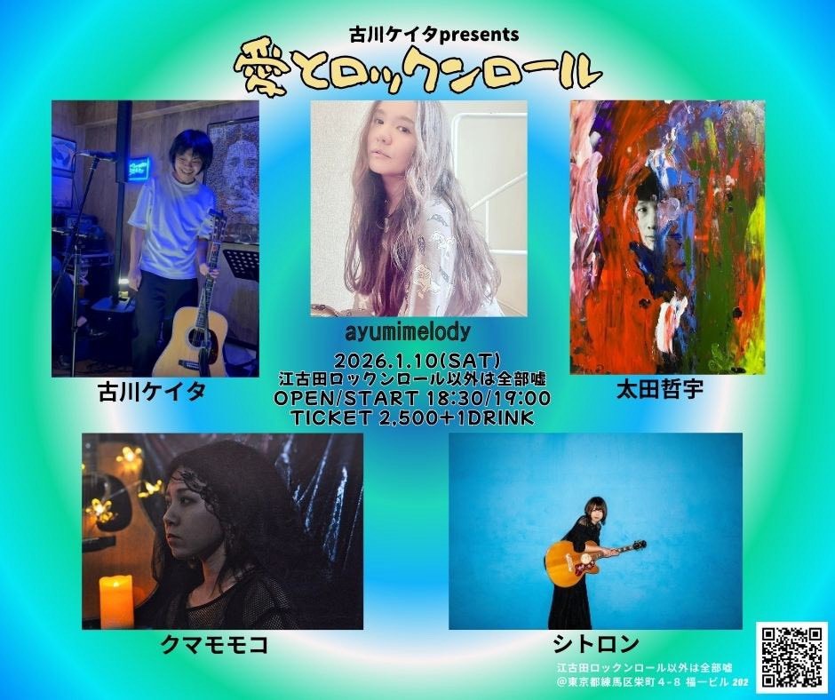 古川ケイタpre. 愛とロックンロール LIVE 2026/01/10(土) 江古田ロックンロール以外は全部嘘 act: クマモモコ シトロン ayumimelody 太田哲宇 古川ケイタ op/st 18:30/19:00charge ¥2,500+1order チケット取り置きは ⏩こちら! URLをコピーする 報告する